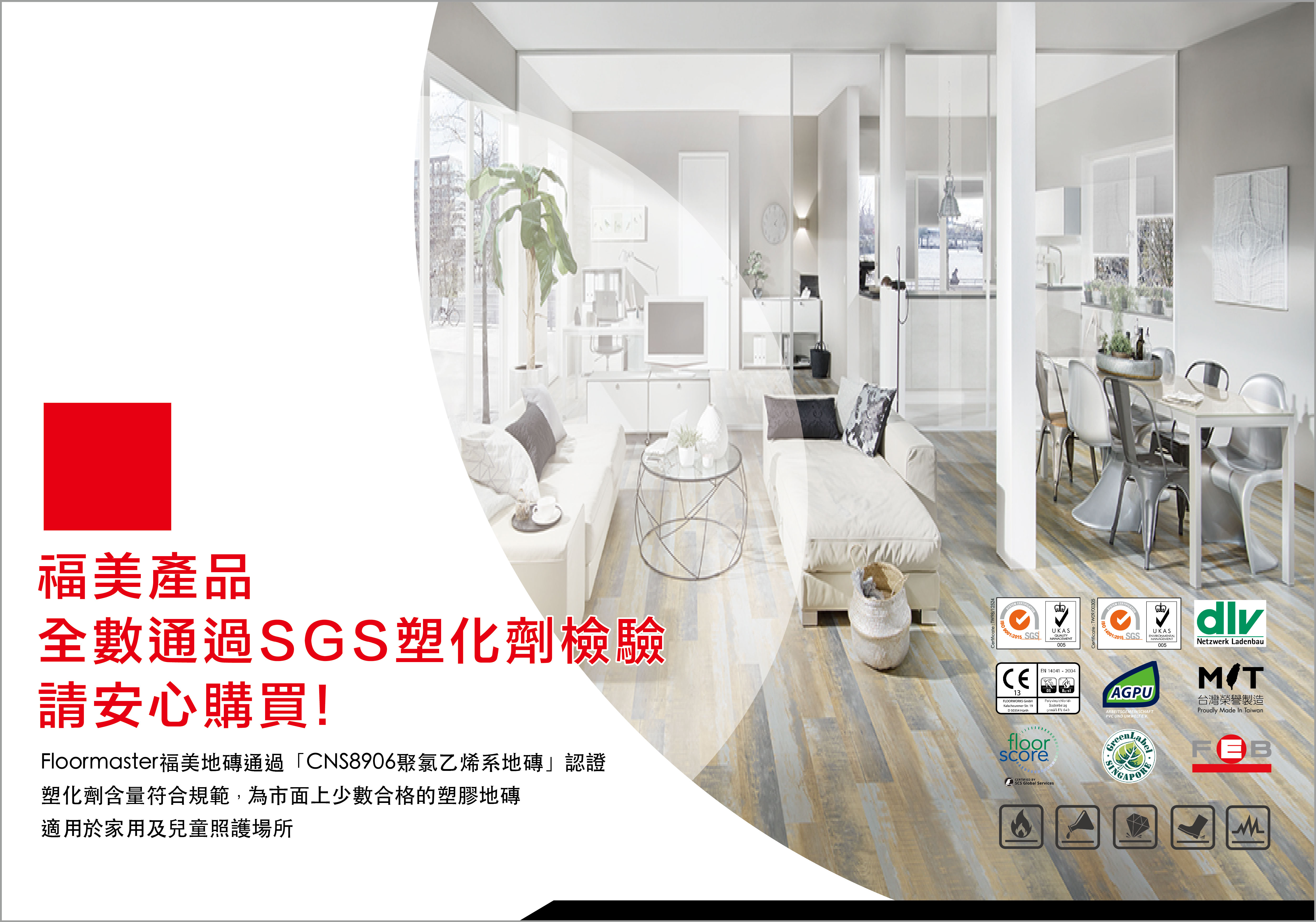 福樂地磚通過「CNS8906聚氯乙烯系地磚」認證,表示塑化劑含量符合法定規範,適用於家用及14歲以下兒童照護場所。